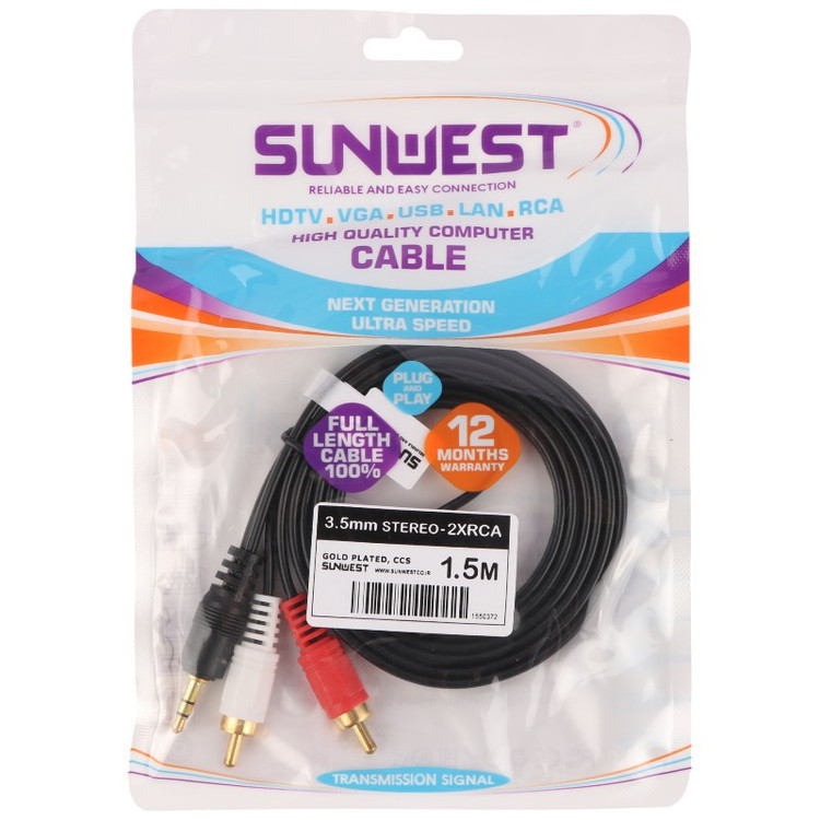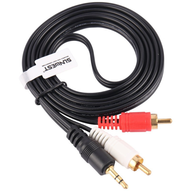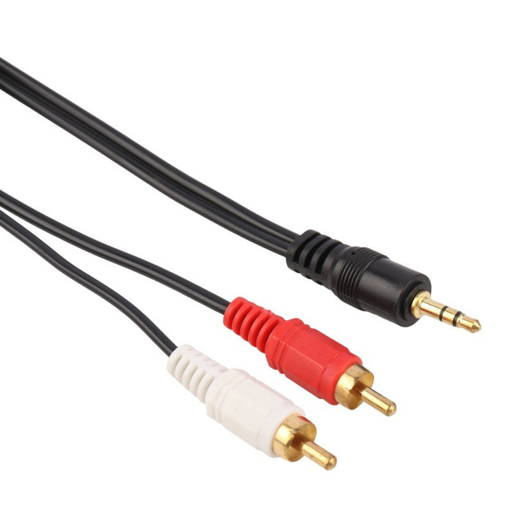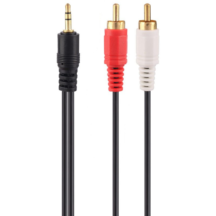 کابل به طول 1.5 متر با روکشی از جنس پلاستیک، دارای یک فیش جک 3.5 میلی متری صدا و دو فیش AV یا RCA