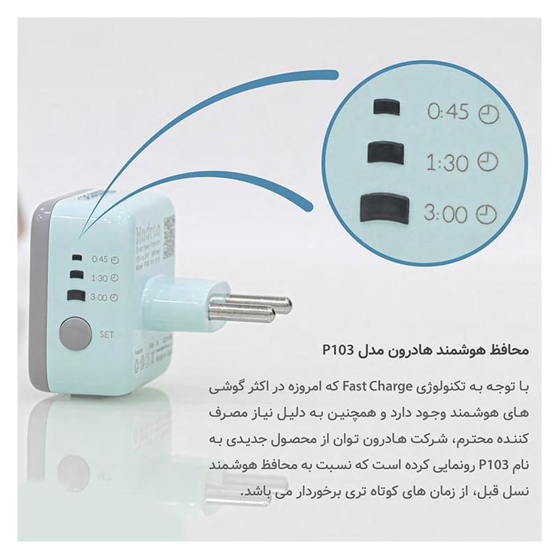 محافظ هوشمند هادرون مجهز به تایمر به منظور حفاظت از وسایل و تجهیزات الکترونیکی طراحی شده است. این دستگاه یک محافظ برق، مبدل و تایمر نیز به حساب می آید. ابعاد کوچک و حمل آسان، محفاظت ولتاژی و فرکانسی دقیق ،سرعت عمل بالا، تایمر قطع کن سه حالته، پریز یونیورسال، استفاده آسان و جریان خروجی بالا از جمله قابلیت های این دستگاه میباشد. با کمک تایمر خودکار این دستگاه میتوانید جریان برق را در سه زمان 0:45 و 1:30 و 3:00 قطع کنید.