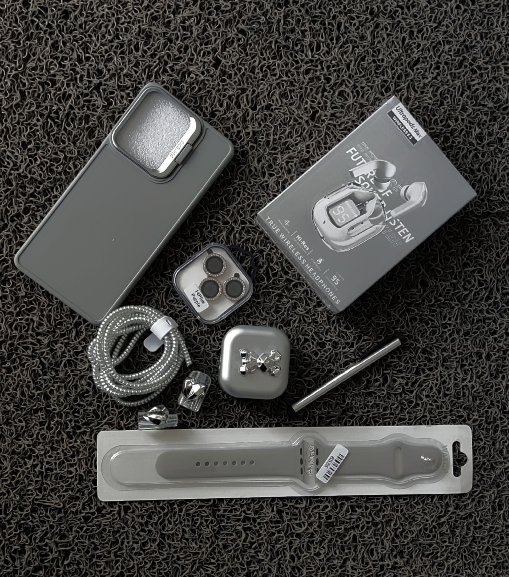 اقلام موجود در پک: ایرپاد -بند ساعت -قاب موبایل ـمحافظ کابل - محافظ کلگی شارژر - محافظ لنز